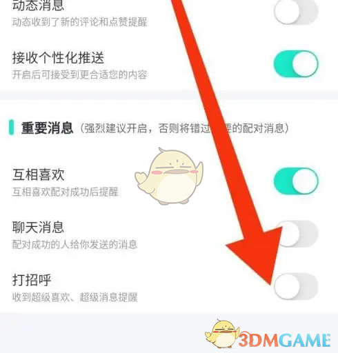 4、在消息通知里,将打招呼功能开启即可。