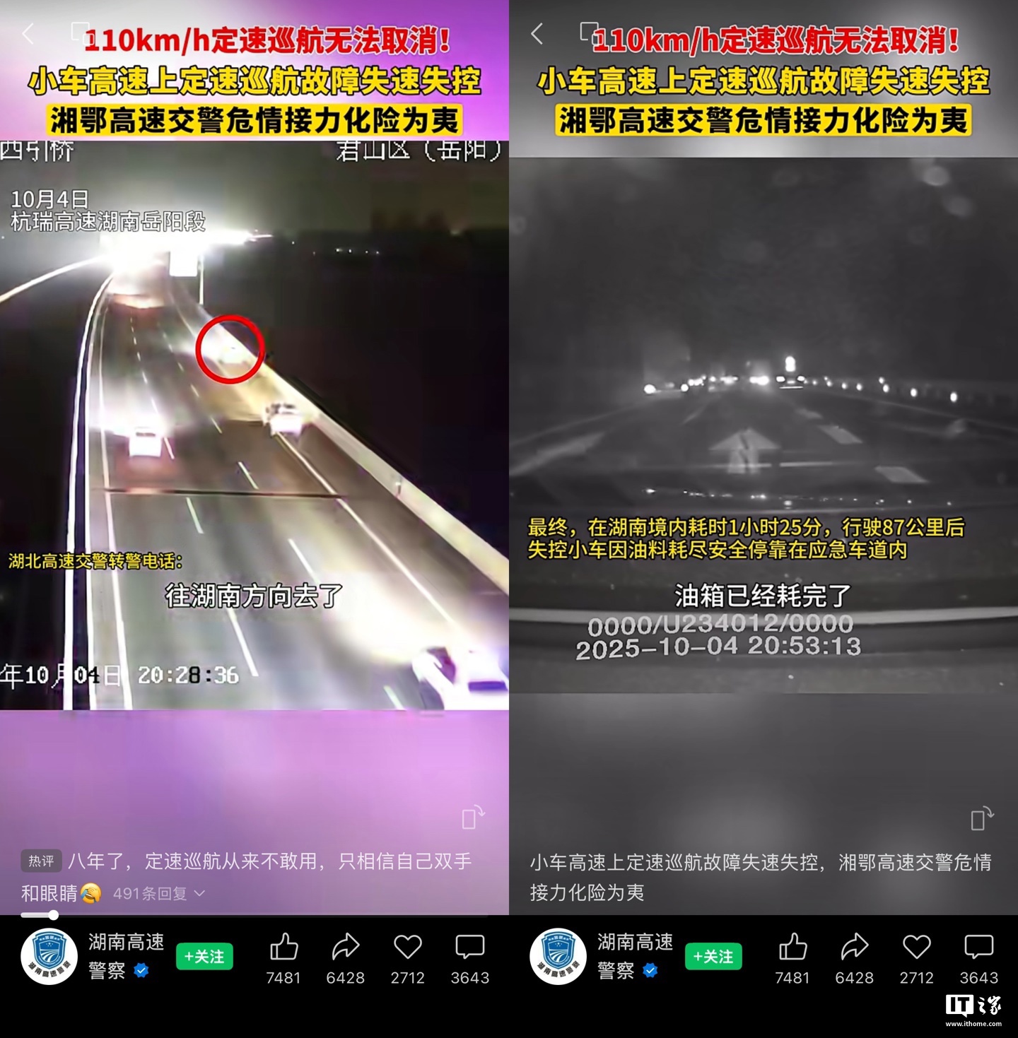 alixixi 10 月 12 日消息,据湖南交警,2025 国庆中秋假期 10 月 4 日晚间,S53 枣石高速由北向南方向,发生一起小车定速巡航失灵,车辆“狂飙 2 小时”的惊险事故。
