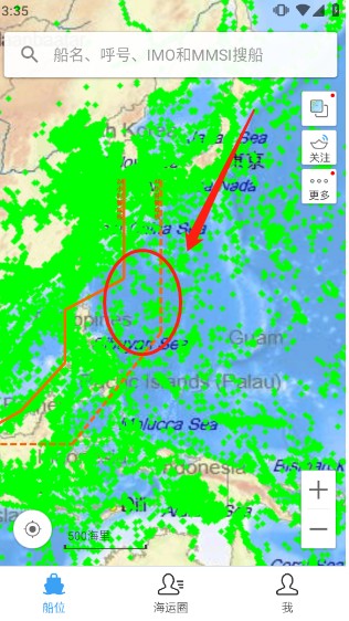 2、放大到一定程度后,在地图上就可以看到当前海域上的船舶了。