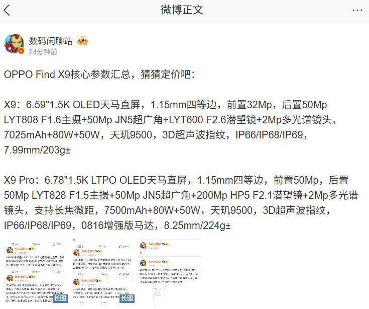 alixixi 10 月 12 日消息,OPPO Find X9 系列手机将于 10 月 16 日 19:00 发布,首批搭载天玑 9500 旗舰芯,博主 @数码闲聊站 今日将该系列新机的参数进行了汇总。