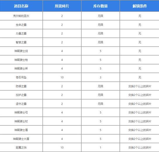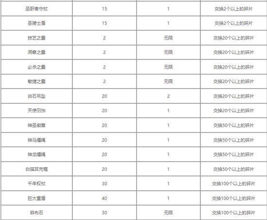 天之碎片可兑换道具
