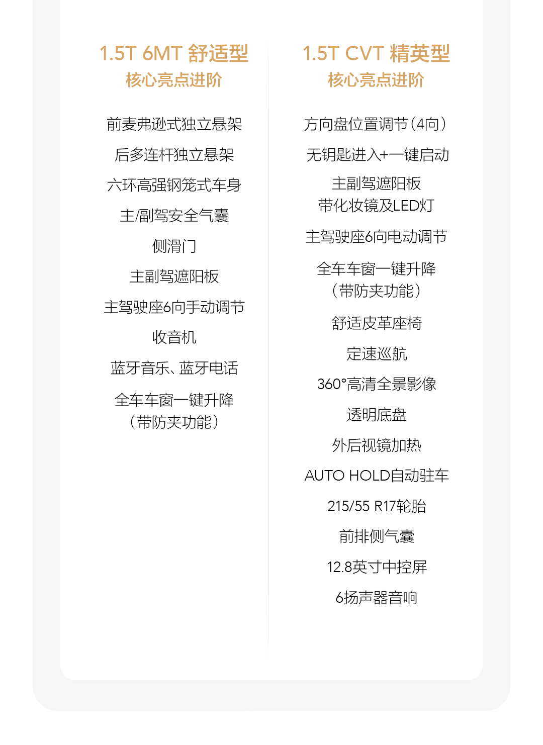 燃油 1.5T 6MT 舒适型 / CVT 精英型:均采用同级领先的全新 1.5T 高扭矩发动机,最大扭矩至高可达 290N・m,标配六环高强钢笼式车身、主 / 副驾安全气囊、主驾车窗一键升降(带防夹功能)等配置,CVT 精英型标配了方向盘位置调节(4 向)、无钥匙进入 + 一键启动、主驾驶座 6 向电动调节、全车车窗一键升降(带防夹功能)、定速巡航、360° 高清全景影像、透明底盘、外后视镜加热、AUTO HOLD 自动驻车、12.8 英寸中控屏等配置。