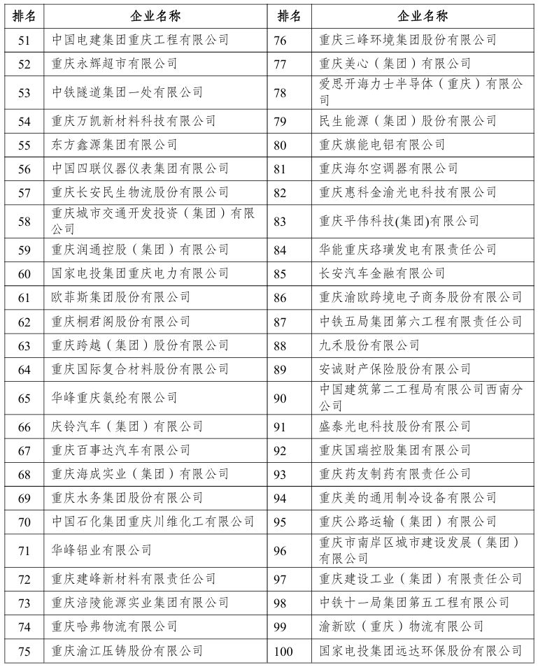 2025 重庆企业 100 强以中国企业联合会制定的中国企业 500 强的标准,经企业自愿申报,按照 2024 年企业营业收入从大到小依次排序产生。