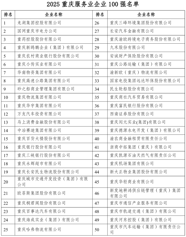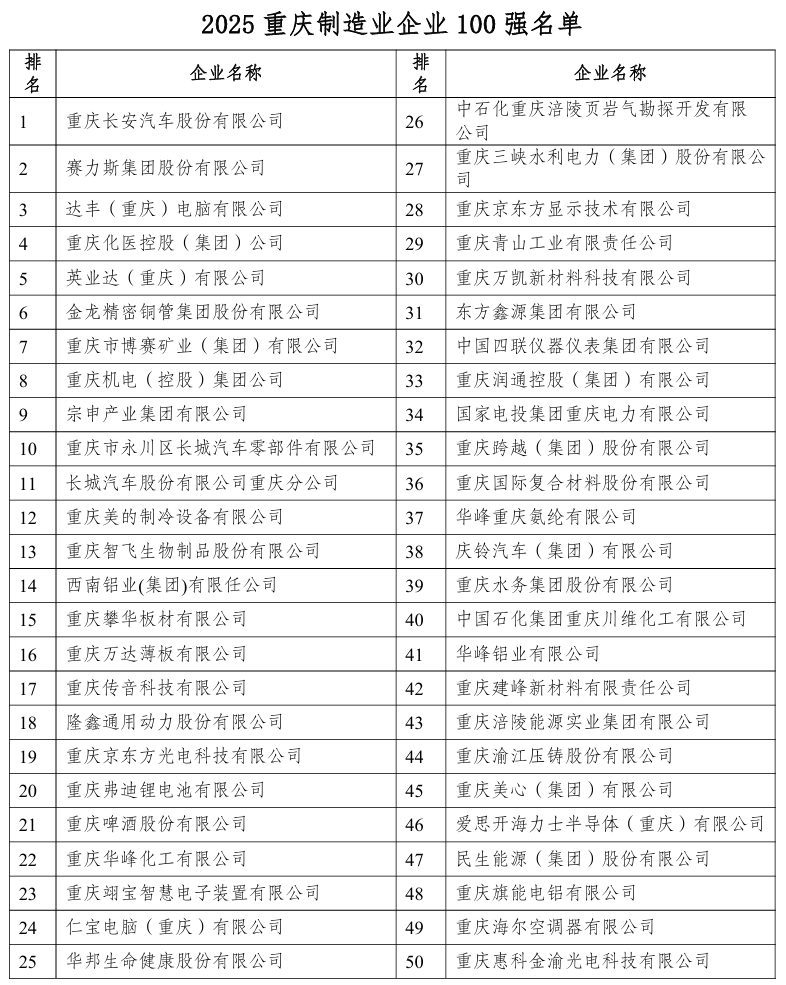 alixixi 10 月 13 日消息,重庆市企业联合会(企业家协会)于 10 月 10 日发布 2025 重庆企业 100 强分析报告及名单。会上同时发布 2025 重庆制造业企业 100 强、重庆服务业企业 100 强分析报告及名单。