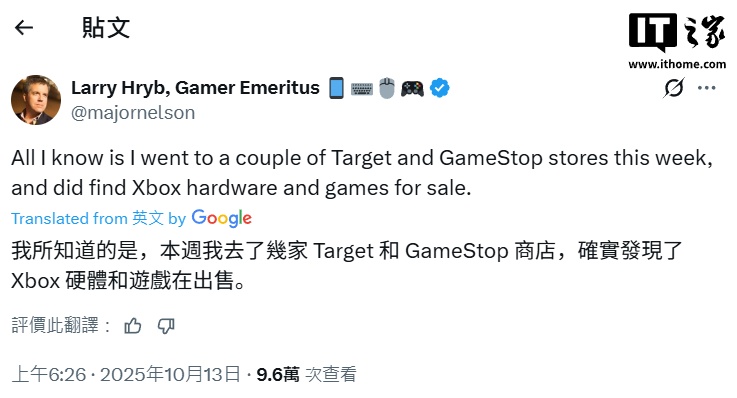 前 Xbox 社区主管 Larry Hryb 今天也在 X 平台表示,他最近走访了多家 Target 和 GameStop 门店,看到这些店仍在出售 Xbox 主机和游戏。