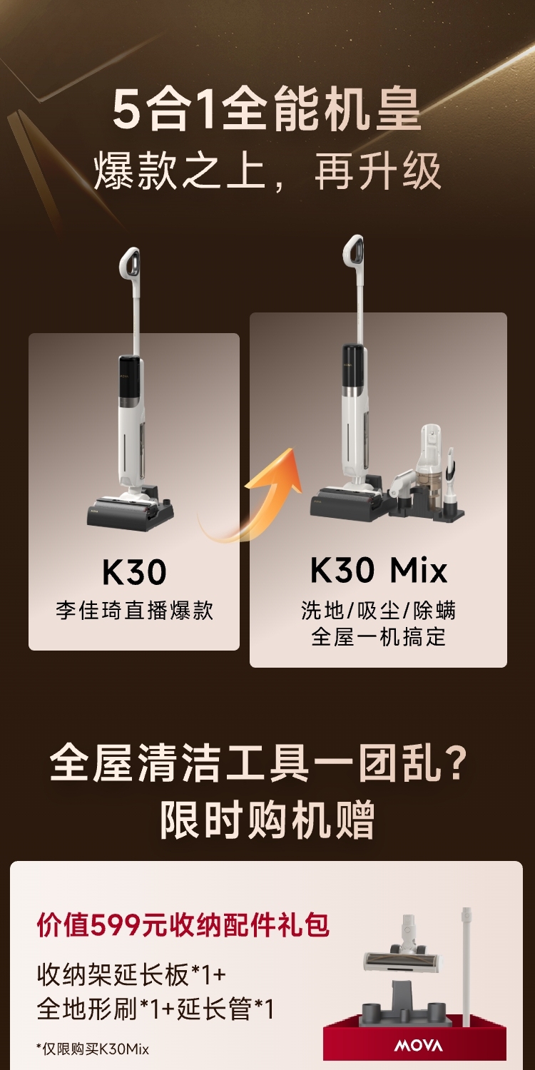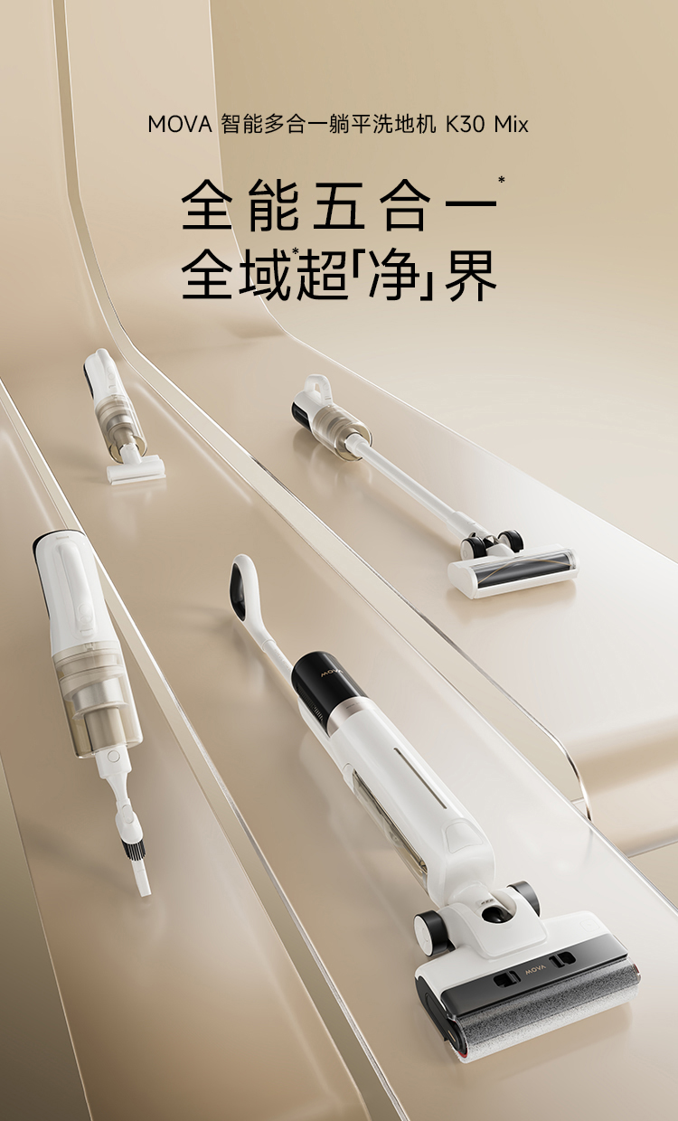 MOVA 多合一躺平洗地机 K30mix 上市售价 4499 元,今日官方叠加大额券 + 国补后,实付 942.65 元即可入手。加赠价值 599 元收纳配件礼包。