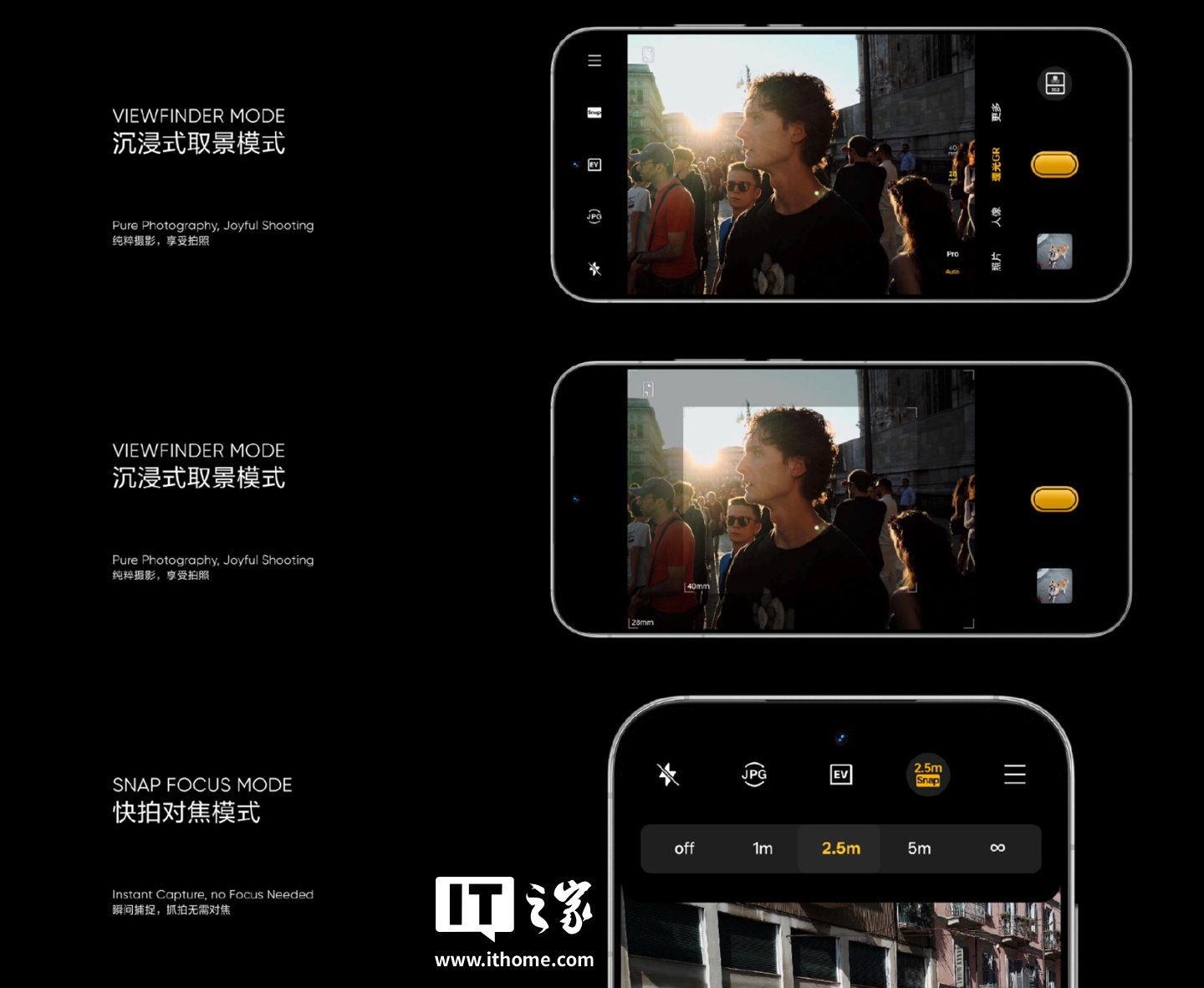 据介绍,诞生于 2019 年 3 月的理光 GR III,保留了捕捉街头场景的 28mm 焦段。而两年后登场的理光 GR IIIx,则用 40mm 焦段开辟了全新街拍视角。而真我 GT8 Pro 便提供了理光 GR 相应 28mm 与 40mm(等效)焦距。
