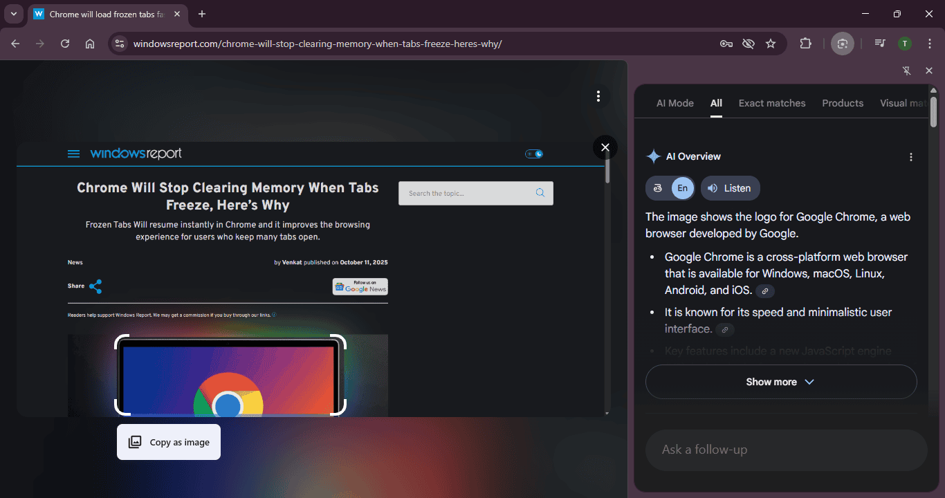 alixixi 10 月 14 日消息,据科技媒体 Windows Report 今天报道,谷歌现已为 Chrome 浏览器的侧边栏功能新增 AI 模式,可让用户在使用 Google Lens 搜索图片时向 AI 提问题。