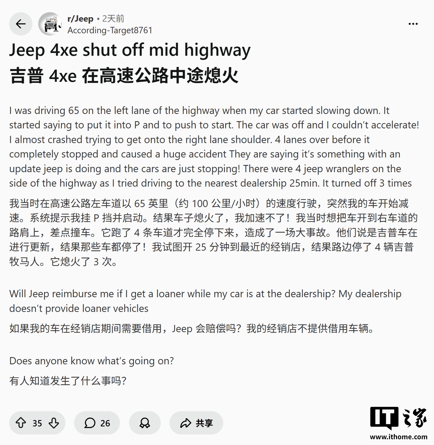 部分车主在住宅区附近低速行驶时遭遇险情,但有车主报告称,车辆甚至在高速公路以 65 英里(约 100 公里 / 小时)的速度行驶时,动力系统也突然完全失效。alixixi附上车主 According-Target8761 报告截图如下: