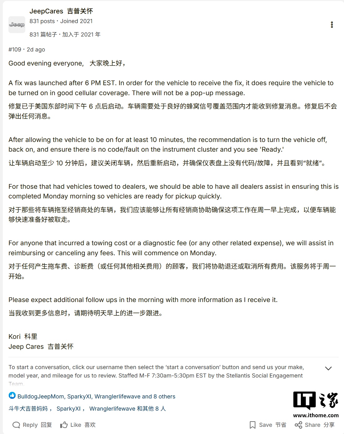 在收到大量故障报告后,Jeep 官方迅速采取行动,紧急撤回了该有问题的软件更新。同时,Stellantis 集团的社交媒体团队在车主论坛上发布公告,建议尚未安装更新的车主忽略系统弹出的更新提示。