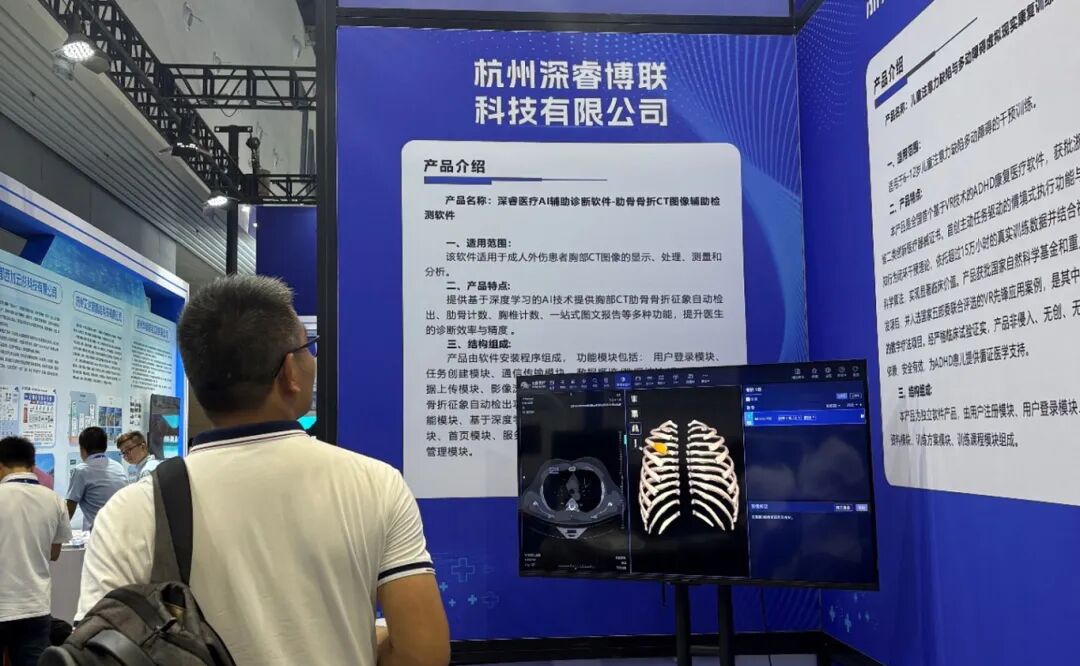 在浙江省医疗器械检验研究院联合展区,深睿医疗展出的肋骨骨折 CT 图像辅助检测软件,以贴合临床需求的实用功能圈粉无数。截至目前,深睿医疗以 14 张 NMPA 三类医疗器械注册证居于行业前列,是浙江AI企业中拥有NMPA三类证最多的企业,其中 2 项获批 "创新医疗器械产品",值得一提的是,深睿医疗还是国内医疗人工智能领域唯一一家同时拥有 AI 智能装备与 AI 影像产品的AI企业。