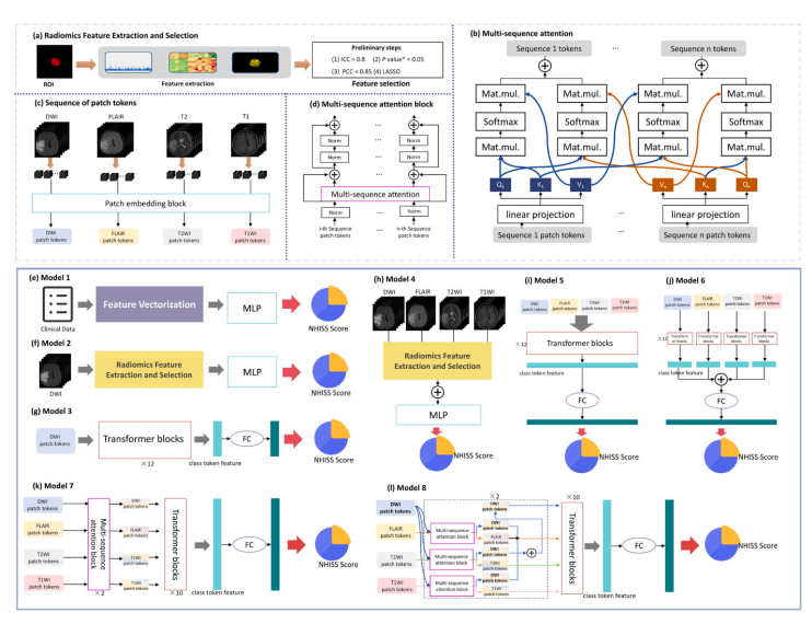 研究团队回顾性收集了一千余例急性缺血性脑卒中患者数据,并根据 NIHSS 评分将患者分为轻度(NIHSS<5)与中重度(NIHSS≥5)两组,构建了八种不同的对照模型,包括临床模型、基于放射组学的单序列 MRI 模型以及基于 Vision Transformer(ViT)的多模态深度学习模型,并探索了早期融合、后期融合、完全交叉融合和 DWI 主导交叉融合等多种融合策略。