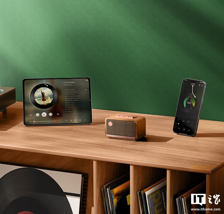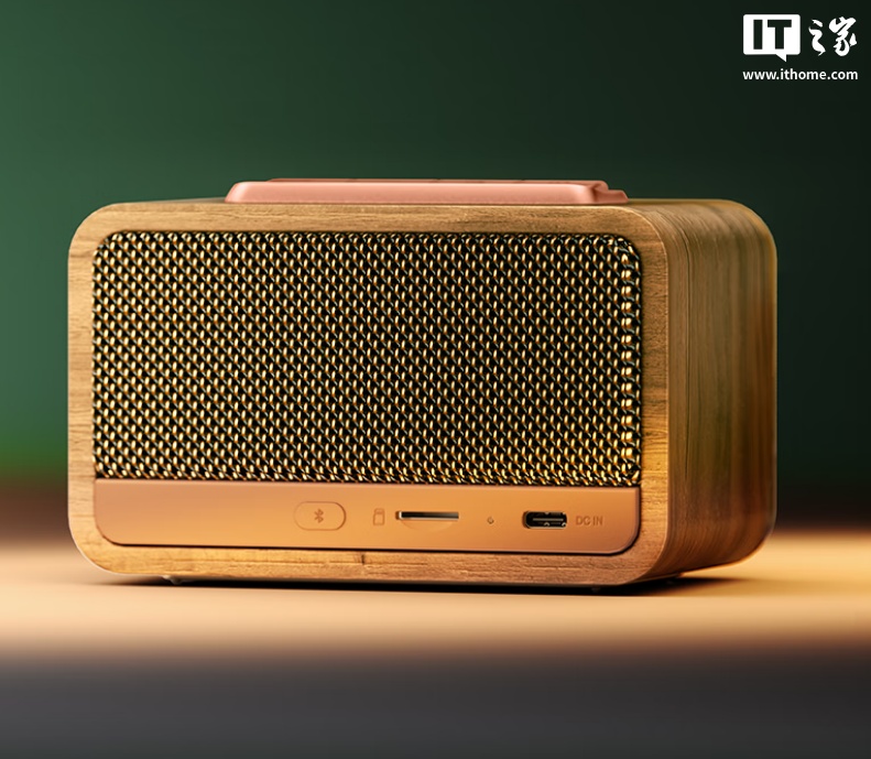 这款音箱只有掌心大小,采用复古设计,尺寸约 120mm×77mm×76mm,重量约 0.44kg,可选五款配色。
