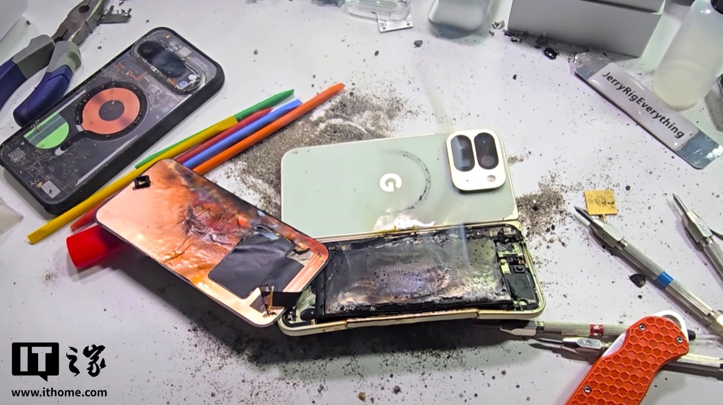 他进一步解释称,过去十年间他以完全相同的方式测试了几乎所有主流智能手机,但这是首次出现引发火灾警报的重大故障。视频结尾处,Pixel 10 Pro Fold 已变成一具冒着烟、烧焦损毁的残骸。尼尔森因此建议用户:切勿将展开状态下的 Pixel 10 Pro Fold 放入衣袋中。