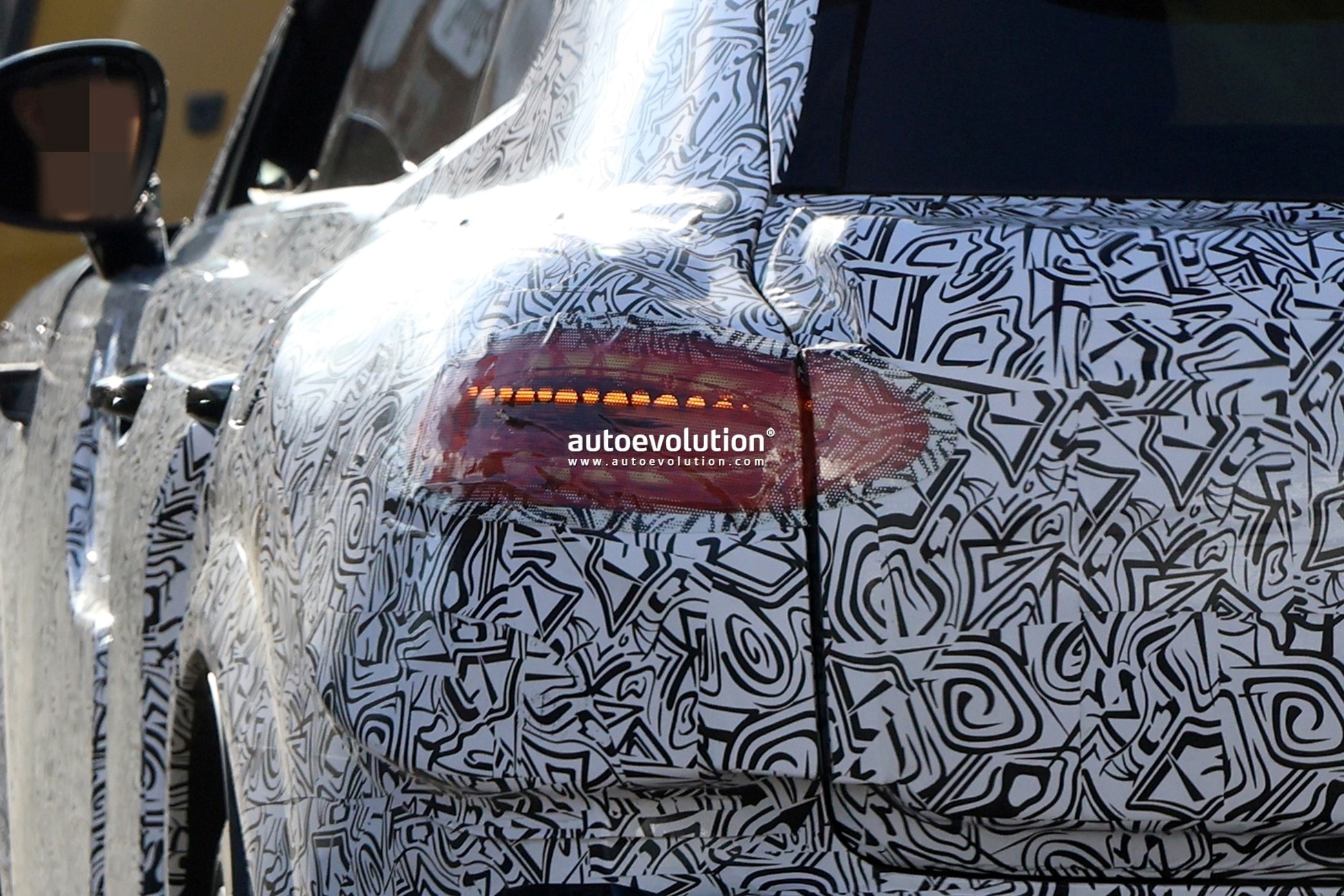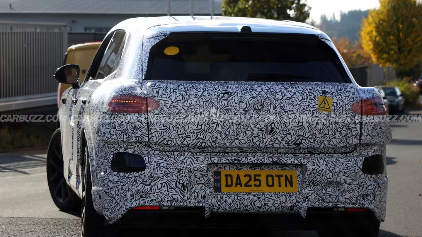 外观方面,车头标志性的四眼大灯实际上只是伪装贴纸,而贴纸下方真正提供照明的,似乎是直接借用自保时捷的四点式 LED 原型灯组。车尾看似宾利家族式的椭圆形尾灯也可能只是伪装的一部分,实际灯组在左右两侧呈现出不同的测试形态。