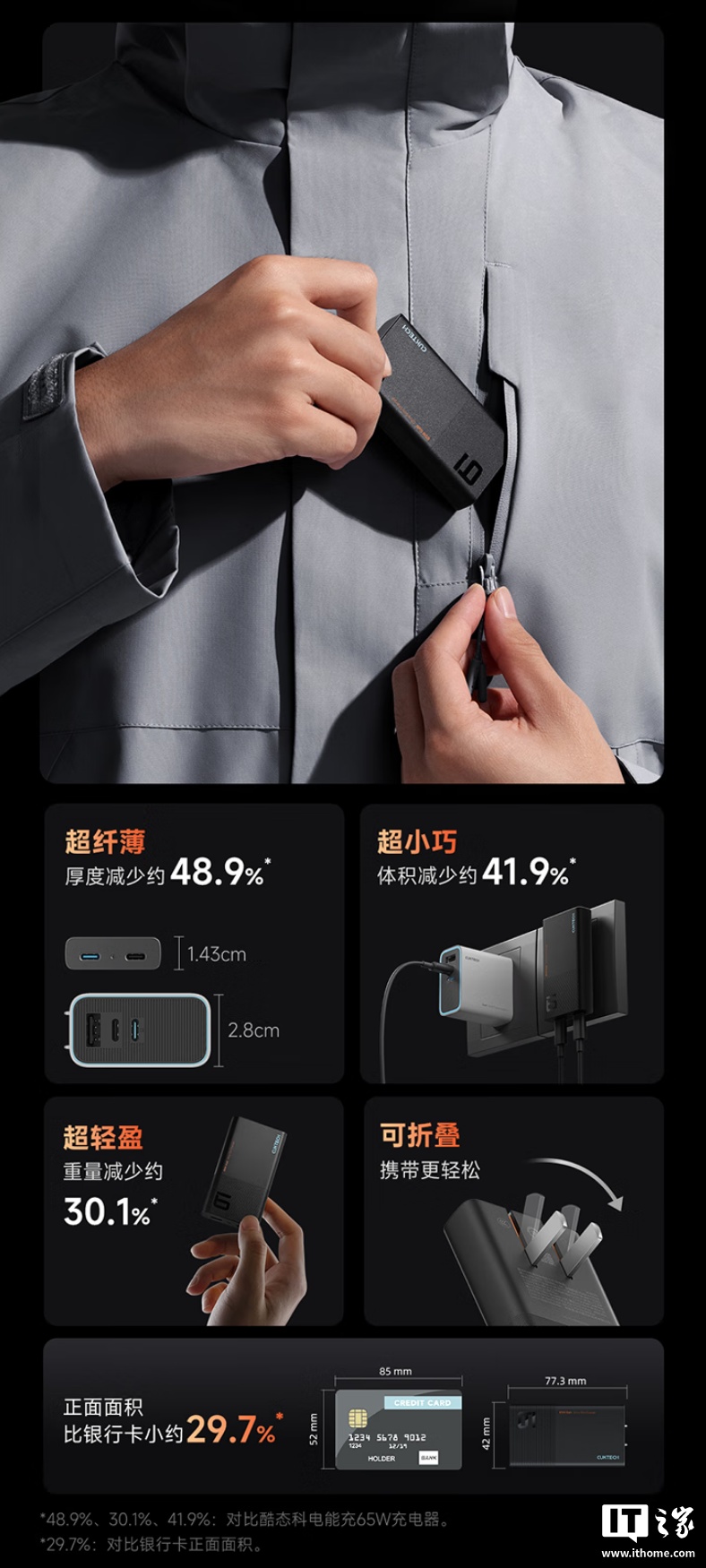 该充电器采用氮化镓技术,厚度约 14mm,橙黑配色,正面面积比银行卡还小,配有可折叠插脚。