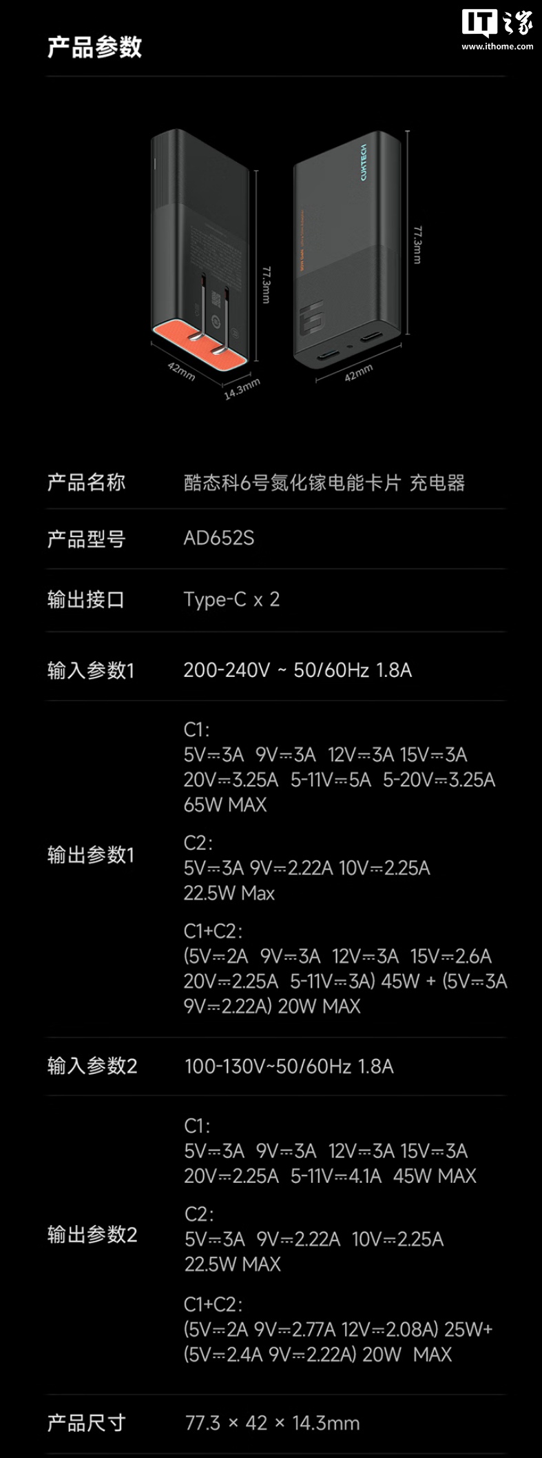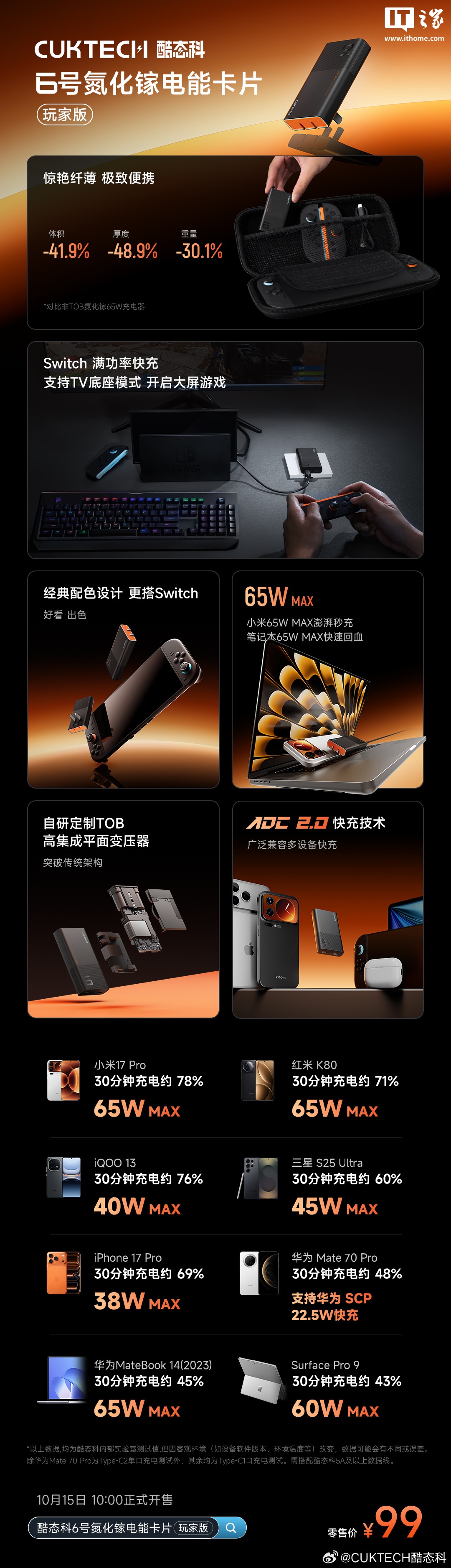 酷态科 6 号电能卡片 「玩家版」支持 65W 快充,可给 Switch 游戏机满功率充电,支持 TV 底座模式;配有双 USB-C 接口,兼容 PD、PPS、QC、SCP 等多种快充协议,宣称主流品牌机型均可快充。