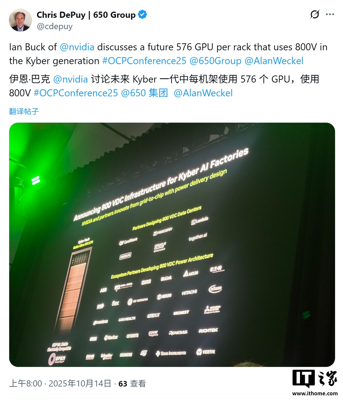 alixixi 10 月 15 日消息,科技媒体 Wccftech 昨日(10 月 14 日)发布博文,报道称在 2025 年 OCP 全球峰会上,英伟达勾勒了“AI 工厂”的未来,展示了 Kyber 机架级技术平台的开发成果,未来将扩展至 NVL576 配置。