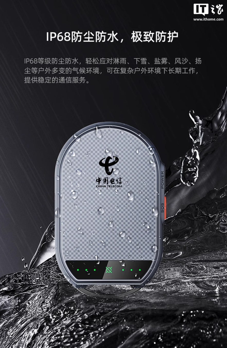这款设备还支持 GPS / 北斗 / 伽利略三系统定位,支持 IP68 等级防尘防水,可应对气候多变的户外环境,适配丛林探险、远海航运、自驾旅行、边防巡逻等场景,机身侧面拥有一颗 SOS 按键,手机没电无法通话时,按下按键就能将带有位置信息的求救短信发给预设的紧急联系人。