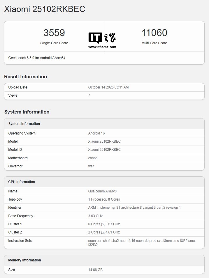 alixixi 10 月 15 日消息,科技媒体 Notebook Check 今天(10 月 15 日)发布博文,报道称小米 REDMI K90 Pro 手机现身 GeekBench 跑分库,6.5.0 版本单核成绩为 3559 分,多核成绩为 11060 分。