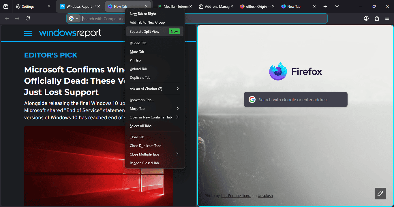alixixi 10 月 15 日消息,科技媒体 Windows Report 今天(10 月 15 日)发布博文,报道称在 Nightly 频道最新火狐 Firefox 浏览器中,Mozilla 正测试“分屏视图”(Split View)功能,可在单个浏览器窗口内并排显示两个标签页,并支持拖动分割线自由调整视图宽度。