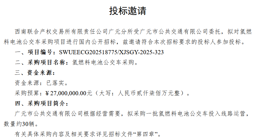 此前招标公告显示,广元市公共交通有限公司根据经营需要,拟采购一批氢燃料电池公交车投入线路运营,数量约30辆,预算2700万元。
