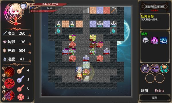 (2)道具用法:在这个区域中玩家必须合理地使用关键道具破墙镐和红钥匙才有可能通关。处理这种魔塔有几个常用的策略:第一个策略“稳扎稳打”就是简单地利用道具打开必开的红门,破必破的墙来拿里面的大宝石等,利用道具将每个小区域都搜刮得差不多再往后打;而另一个很常用的策略则是“偷高层”,其含义是利用手头的关键道具,绕掉挡路强敌,提早来到怪物相对于自己更强的高层(后面的)区域并拿到更多的能力,因为越往后虽然怪物越强但宝石往往也越多,之后就能以更小的代价清理之前的楼层。当前区域需要采用哪种策略就需要玩家多探路多分析了,这类魔塔玩多了自然就有心得了。