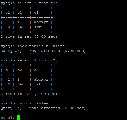 MySQL语法:lock tables t2 write;unlock tables;,解锁之前其他session无法获取到对应的写锁,unlocks table之后释放锁