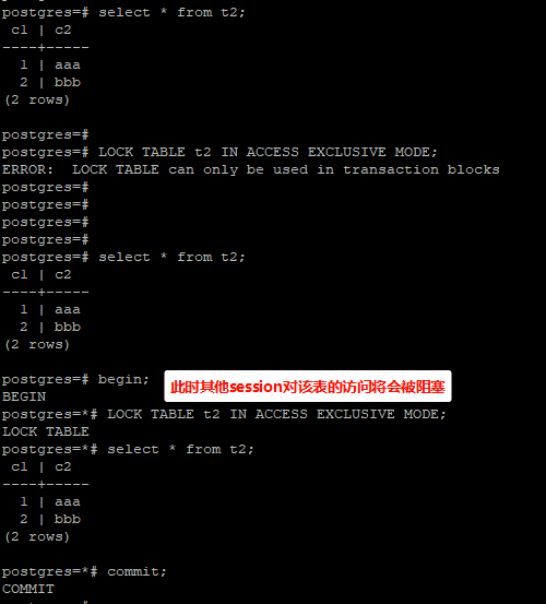 PostgreSQL语法如下,解锁之前其他session无法获取到对应的读或者写锁,unlocks table之后释放锁