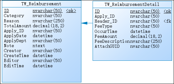 如报销申请单主表和明细从表,数据库设计关系如下所示。