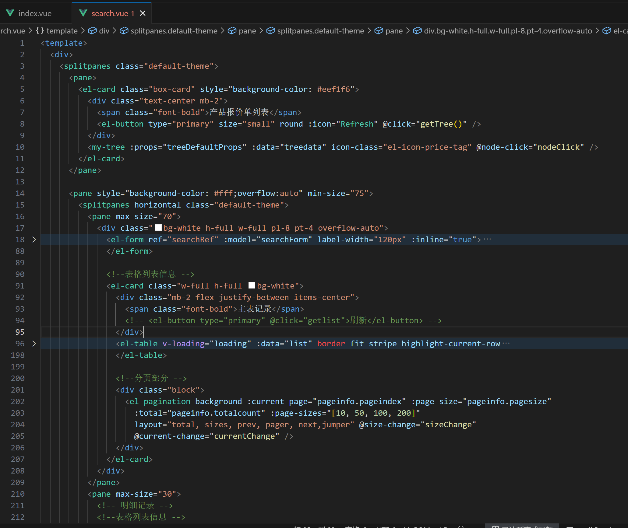 列表页面的主要逻辑封装在search.vue页面中,包括左侧树形列表区域,查询条件区域、主表记录显示、分页展示区域、从表记录区域等。