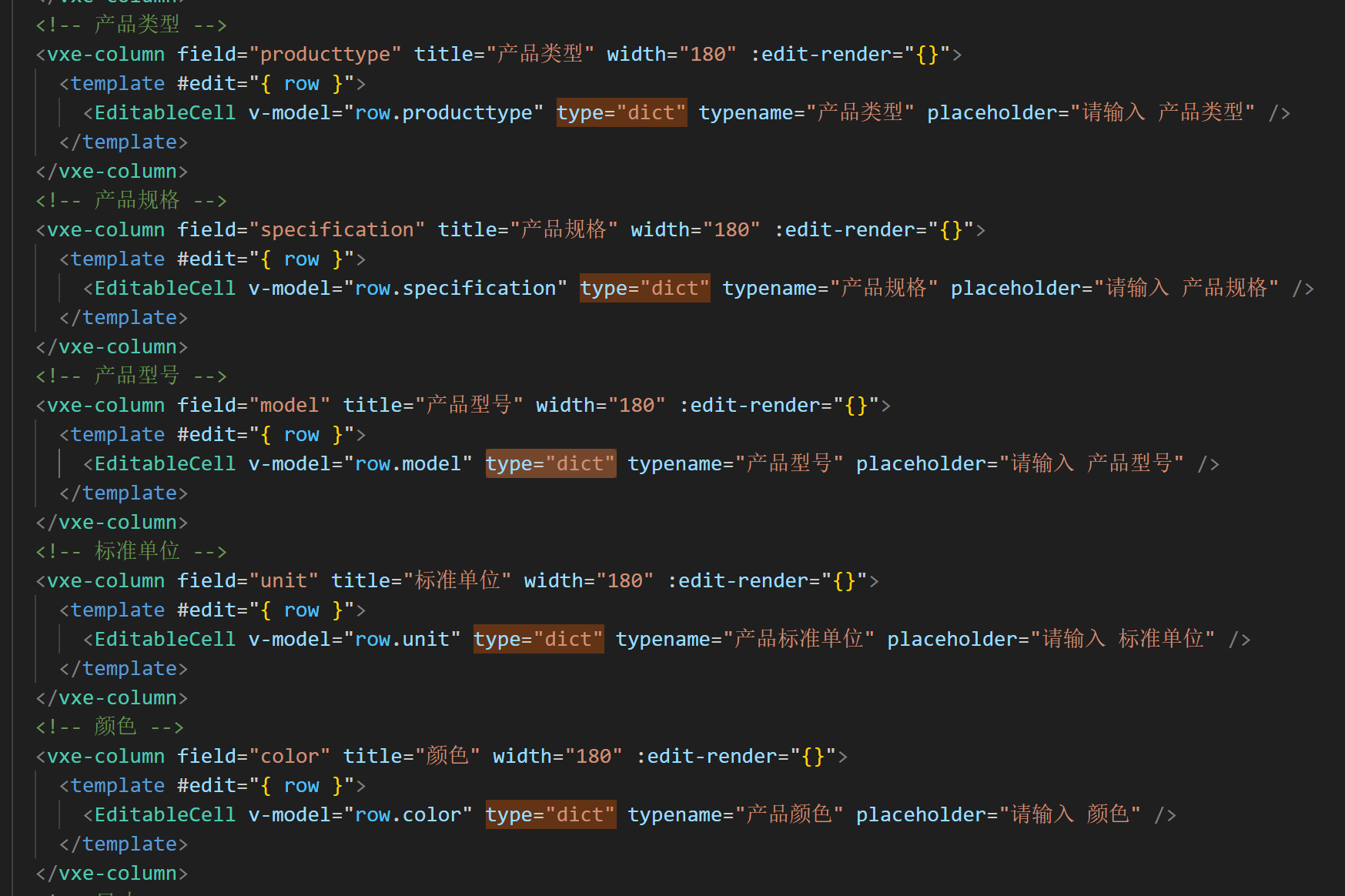 在编辑界面中,主表和常规单表一样的处理方式,从表记录通过 vxe-table 进行录入的处理。对于产品记录的列表选取,我们通过自定义组件 TableSelector 快速绑定即可即可。