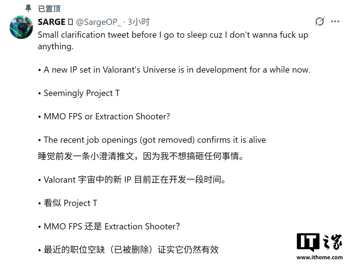 消息称该项目设定在《无畏契约》(Valorant)宇宙,是一款大型多人在线第一人称射击(MMOFPS)或撤离射击游戏。此前,相关招聘信息已暗示该项目进入预制作阶段,并将其描述为一款“高辨识度的风格化游戏”。