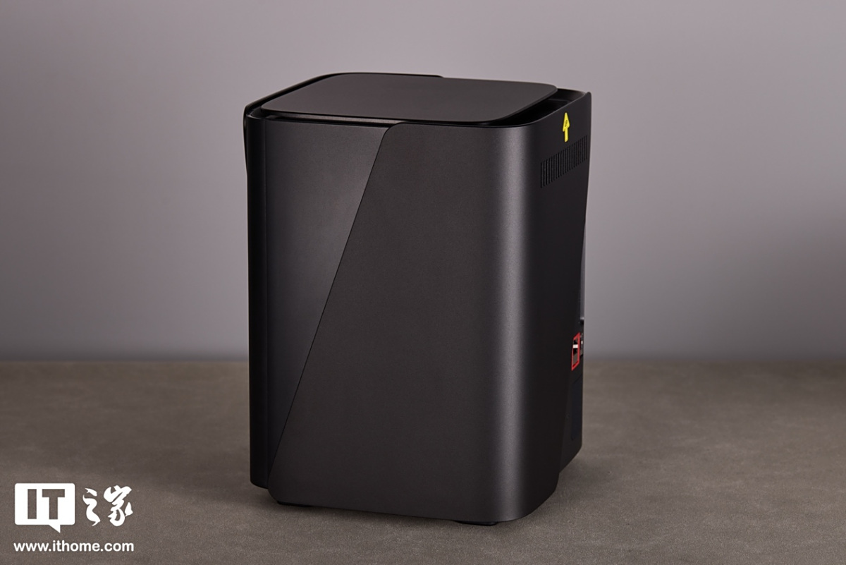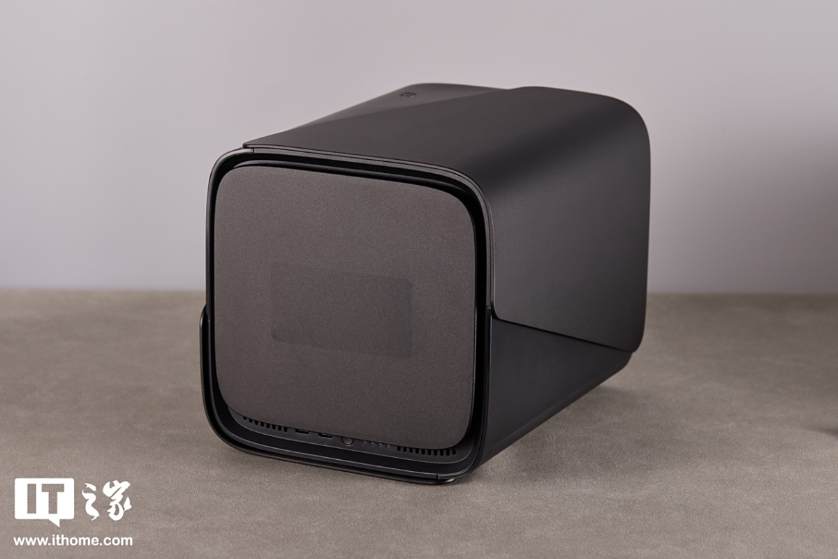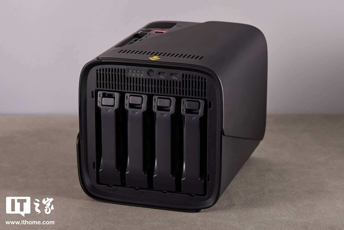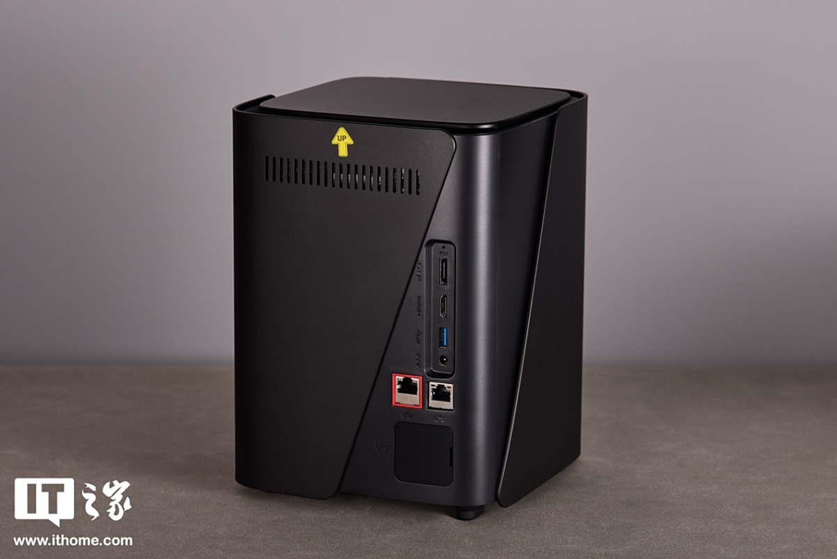 机身背部巧妙的将接口隐藏在了斜向盖板的右下方,从上到下依次为用于外接硬盘柜的 eSATA 接口、HDMI 2.1 接口、USB 3.2 Gen2 接口、供电接口、一个万兆网口(红色)、一个千兆网口,以及最下方的 UPS 接口。