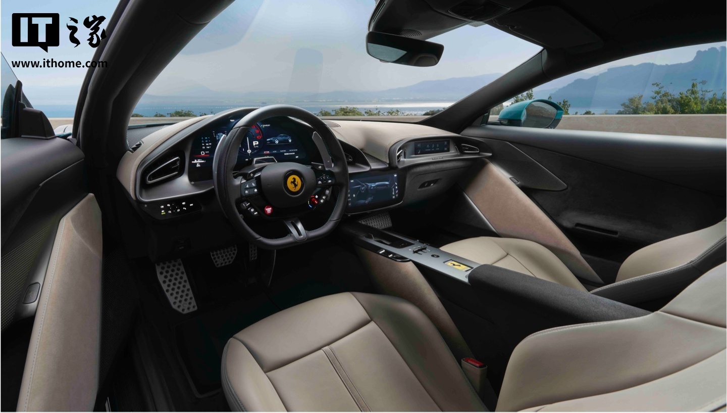 内饰设计方面,法拉利 Amalfi 全新方向盘左侧的铝制启动按钮重新回归,成为驾驶者启动车辆的独特仪式。方向盘集成了驾驶辅助系统(ADAS)、自适应巡航控制系统、电话及语音控制按钮、显示屏视图选择器、雨刷控制按钮和转向灯开关等功能,背面的两个旋钮则用于音量调节与电台切换,操作便捷且富有科技感。