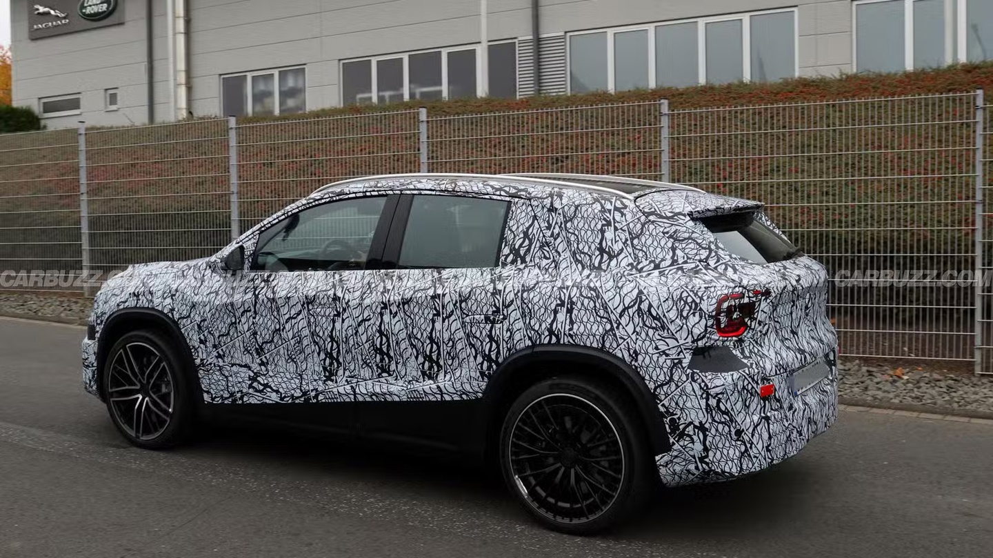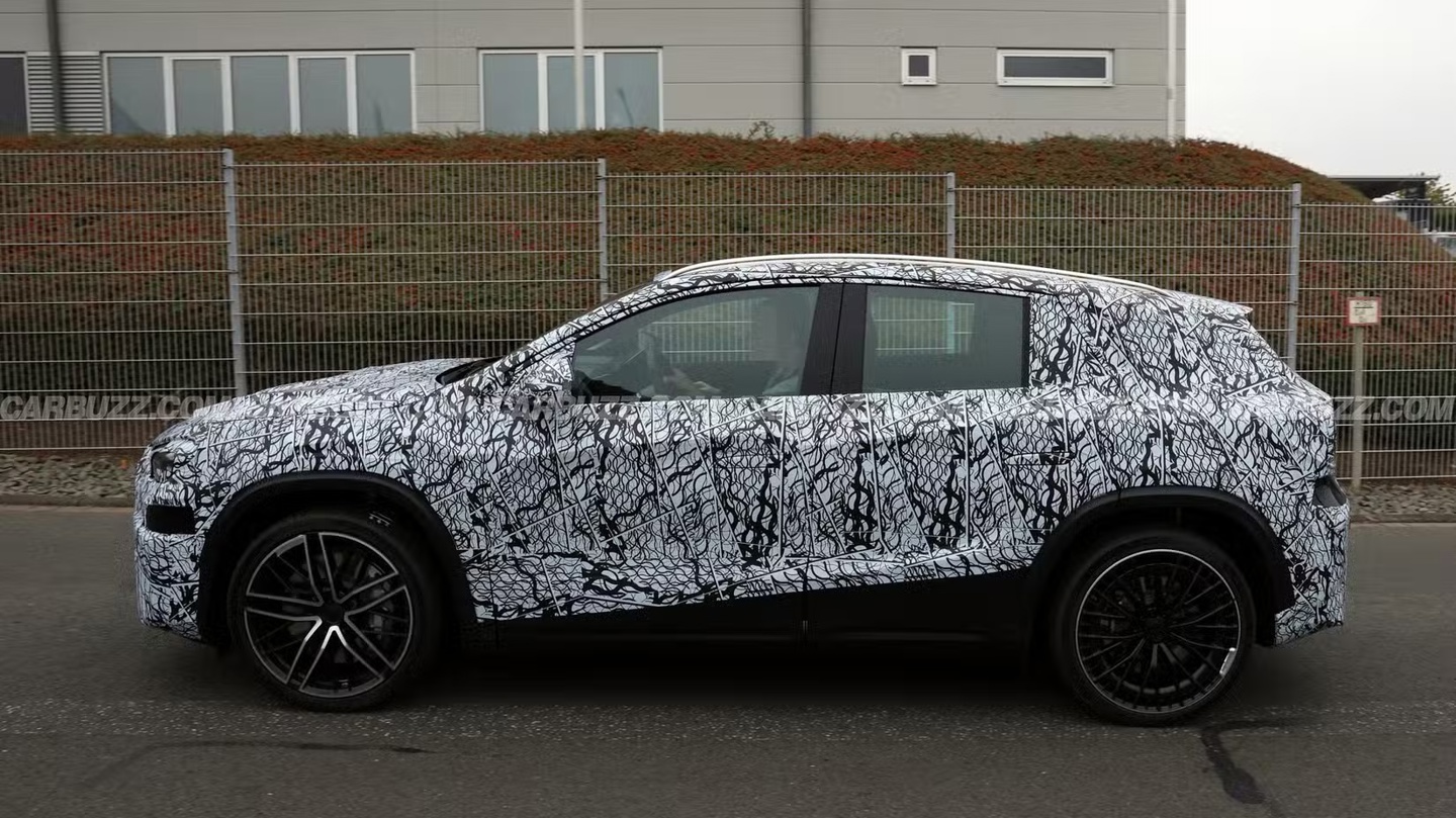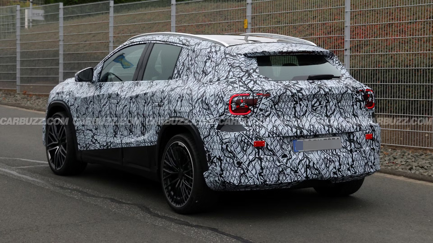 车身线条一改现款车型的圆润感,采用了更挺拔、更高档的轮廓,此外大尺寸轮毂与低扁平比轮胎的组合,暗示其是一辆 AMG 高性能版本或配备了 AMG 运动套件的车型,因此该媒体推测是全新纯电 GLA 的高性能版本。