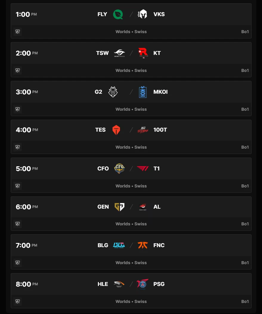 AL 力克 LCK 队伍 HLE、TES 则顺利战胜了来自 LEC 的 G2;而 BLG 则是爆出首日唯一大冷门,负于 LTA 三号种子 100T。其它比赛中 TSW 胜 VKS、CFO 胜 FNC、KT 胜 MKOI、T1 胜 FLY、GEN 胜 PSG。