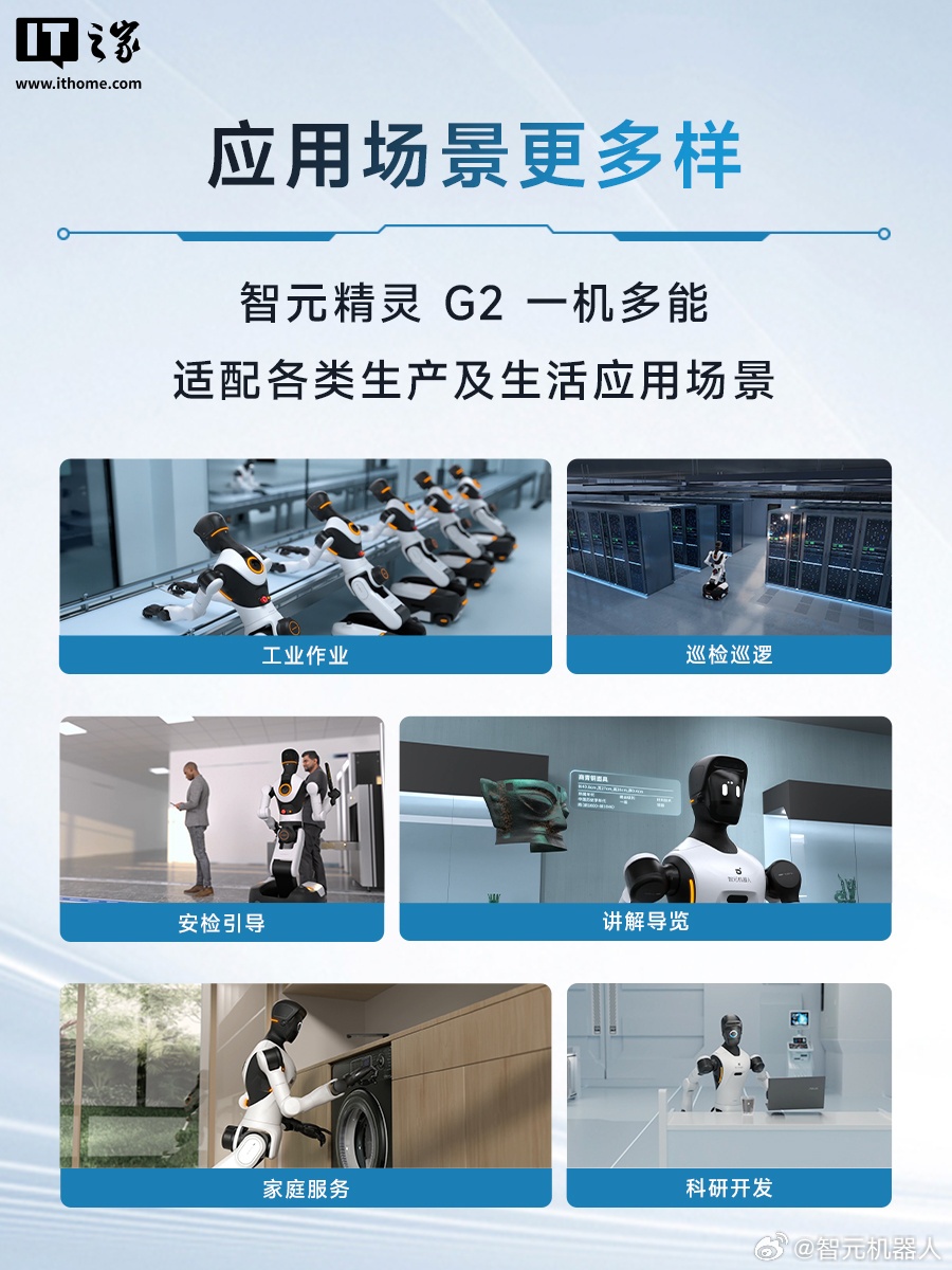 智元精灵 G2 的多功能性使其能够适配各类生产及生活应用场景,包括工业作业、巡检巡逻、安检引导、讲解导览、家庭服务还是科研开发。