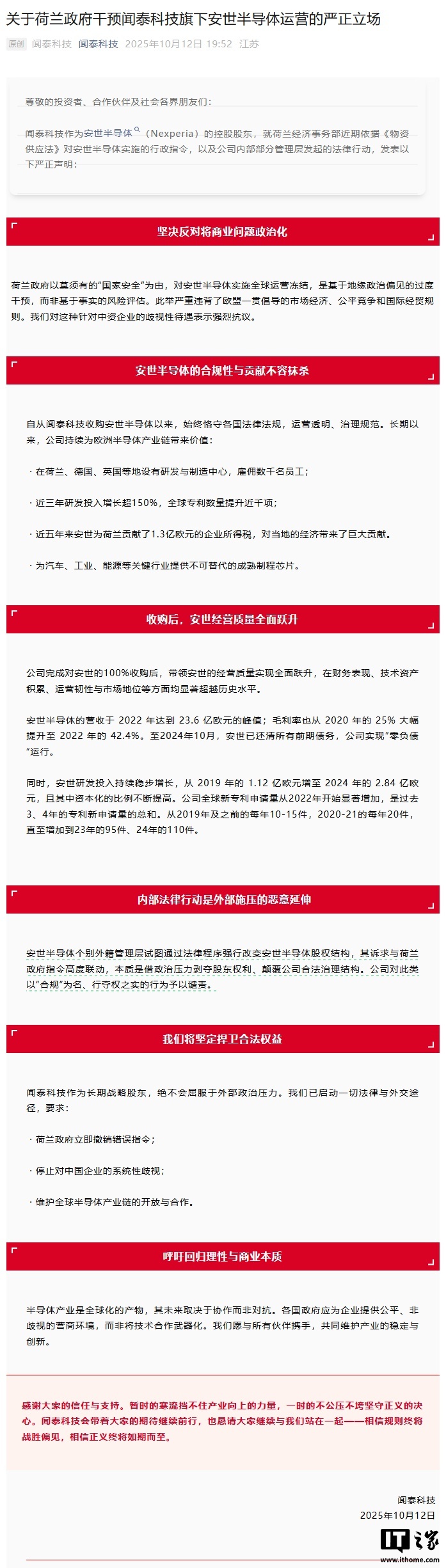 闻泰科技 10 月 12 日晚发表声明,谴责荷兰政府以“国家安全”为由冻结安世半导体全球运营,称此举违背市场经济原则。安世半导体个别外籍管理层试图通过法律程序改变股权结构,闻泰科技认为这是借政治压力剥夺股东权利。公司表示将捍卫合法权益,呼吁回归商业本质。