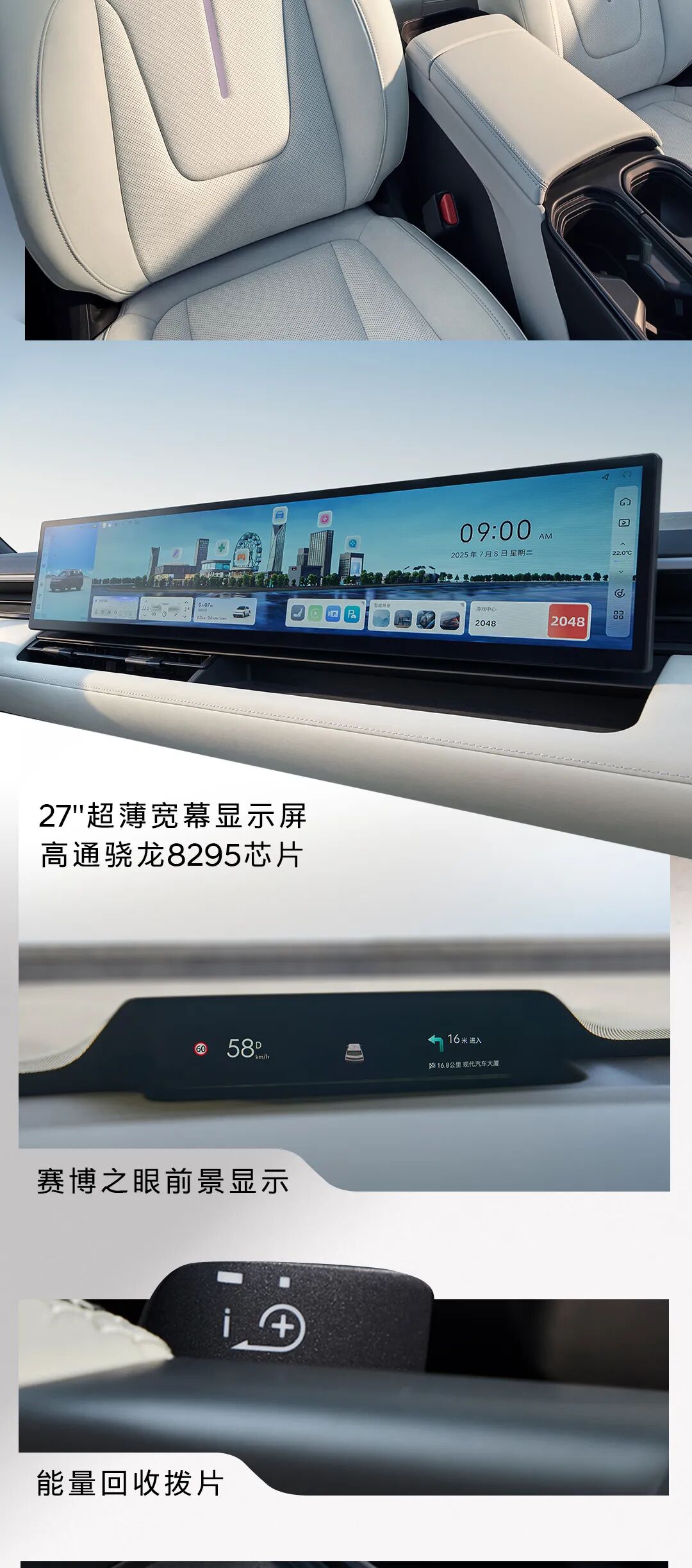 该车内饰采用大尺寸中控屏 + 副驾娱乐屏组成的 27 英寸一体式连屏设计,中控台取消了传统物理按键,同时标配 HUD 系统,支持普通 / 极简 / 地图三种显像模式自由切换。