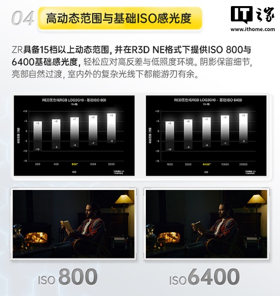 除了 R3D NE RAW,用户还可以选择 N-RAW、苹果 ProRes RAW HQ 等格式录制视频,具备 15 档以上动态范围,在 R3D NE 格式下拥有 800 和 6400 两档基础感光度,可让用户在光照不足的情况下也能拍出低噪点的成片。
