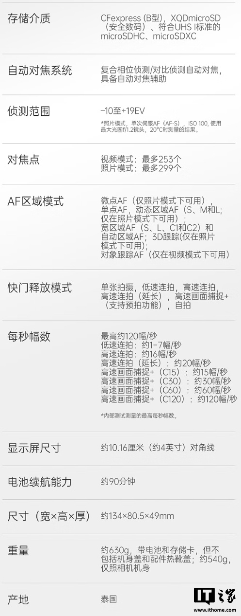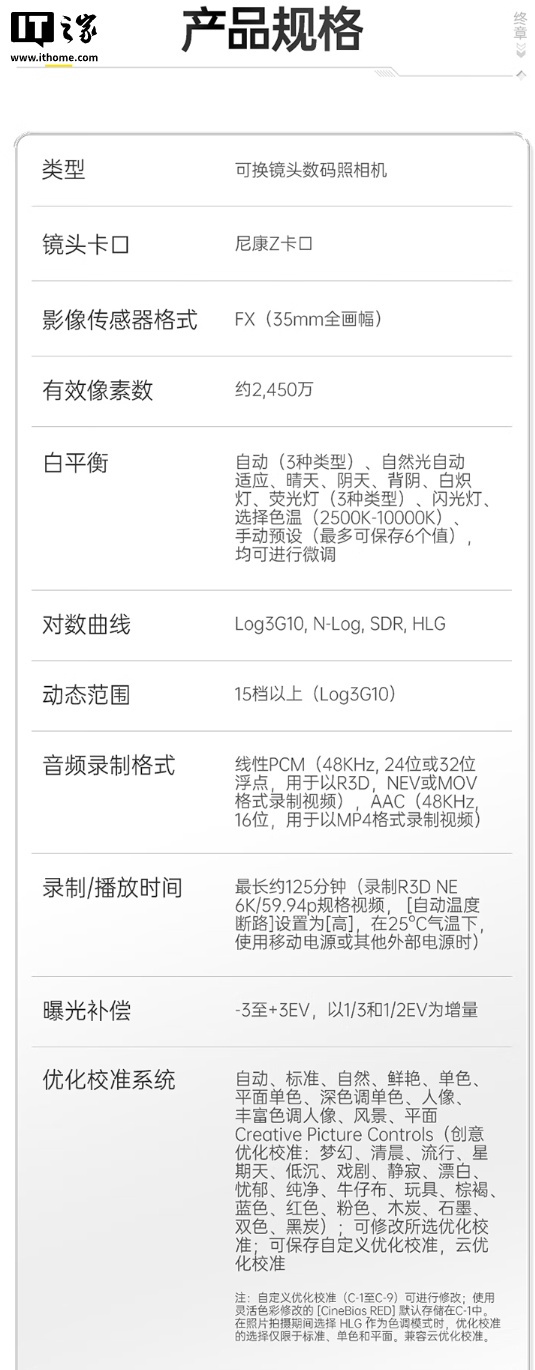硬件方面,这款相机搭载尼康 Z6 III 同款的 2400 万像素部分堆栈式全画幅 CMOS,搭配 EXPEED7 处理器,支持 7.5 档五轴机身防抖,配备 4 英寸屏幕,亮度可达 1000 尼特,机身重量约为 630 克(含电池和存储卡),还支持录制 32 位浮点录音。