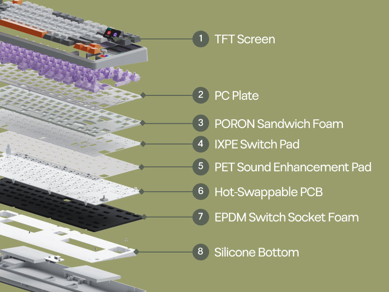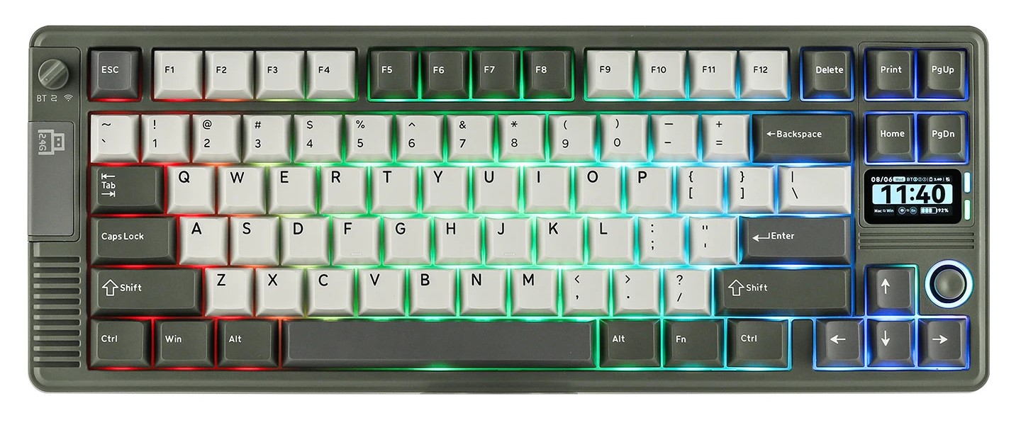 EPOMAKER RT85 可选军绿或者白灰配色,无论是颜色外观、梳齿纹理还是拨杆式三模切换均彰显其复古魅力。而 1.47 英寸 TFT LCD 显示屏和方向键区右侧的多功能摇杆则为其注入了现代功能。