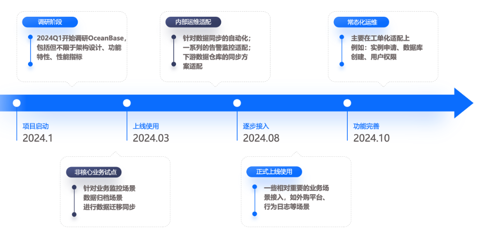 前期使用 OMS 进行全量 + 增量同步,以及数据一致性校验。完成一致性校验后,业务停写,业务添加 OceanBase 写入,完成和 MySQL 的双写。持续双写一个月无异常后,业务确认 OceanBase 满足需求,于是下线 MySQL,只写入 OceanBase。OceanBase 运行至今,业务侧从未反馈存在抖动问题。