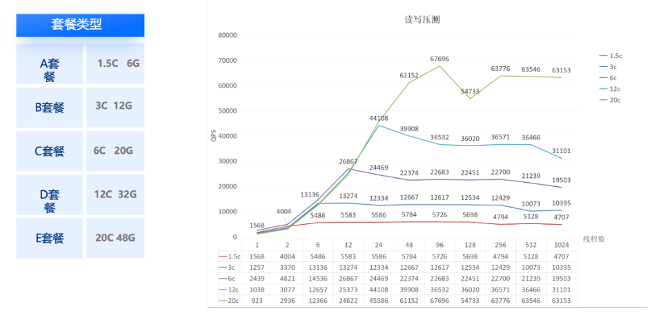 数据库团队针对每一种租户套餐的资源规格进行了性能压测,详细数据见图2,当然该数据仅用于内部选型与容量规划,并非 OceanBase 的极限性能。
