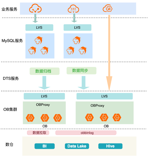 基于 OceanBase 的高压缩能力,将 MySQL 中的冷数据,通过 OMS 或其他导入工具,定期归档到 OceanBase 中,释放存储空间,降低存储成本。
