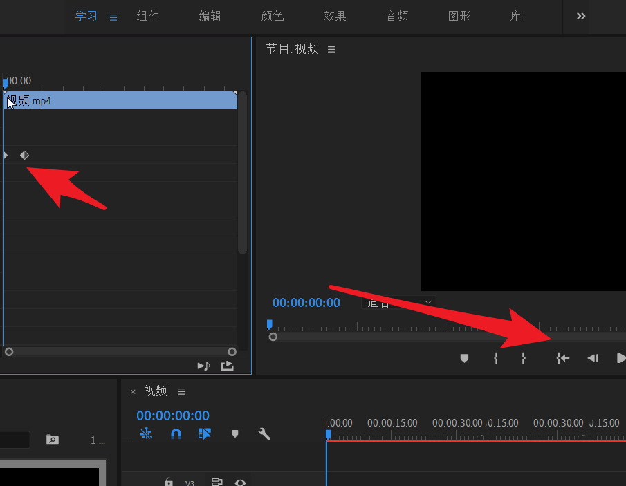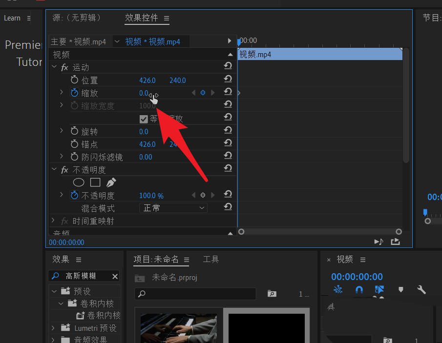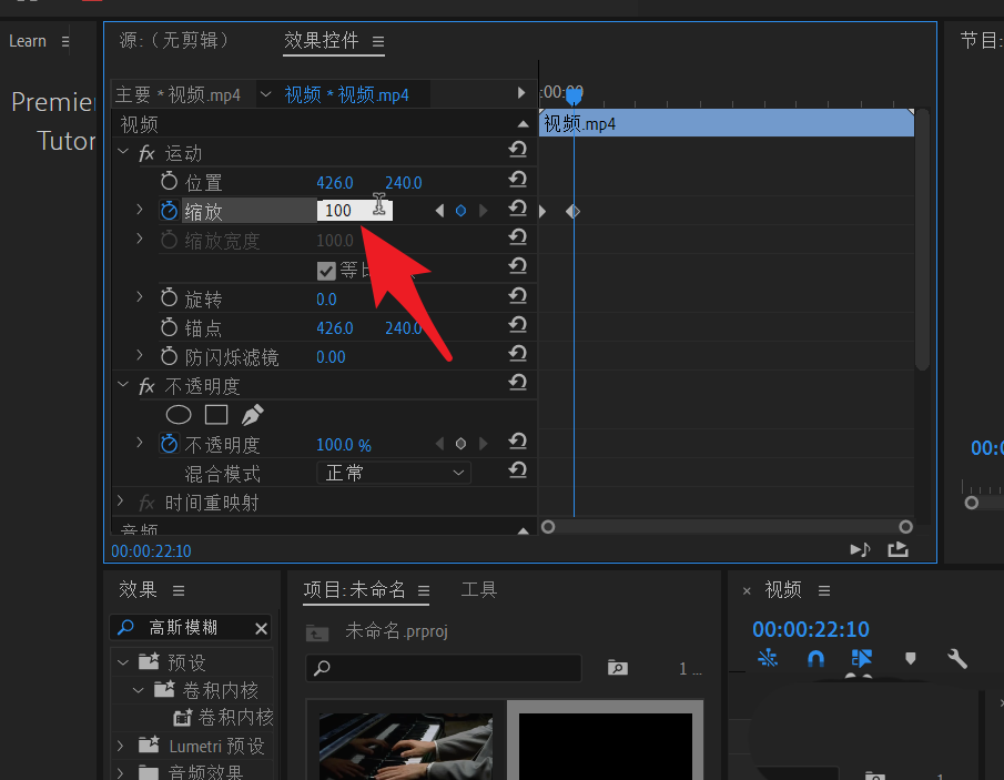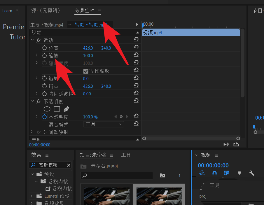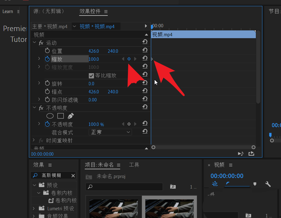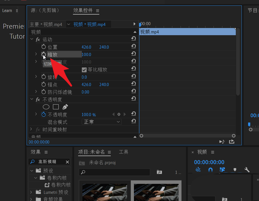 把视频导入到时间轴。点击打开效果控件面板。如下图可以看到缩放。
