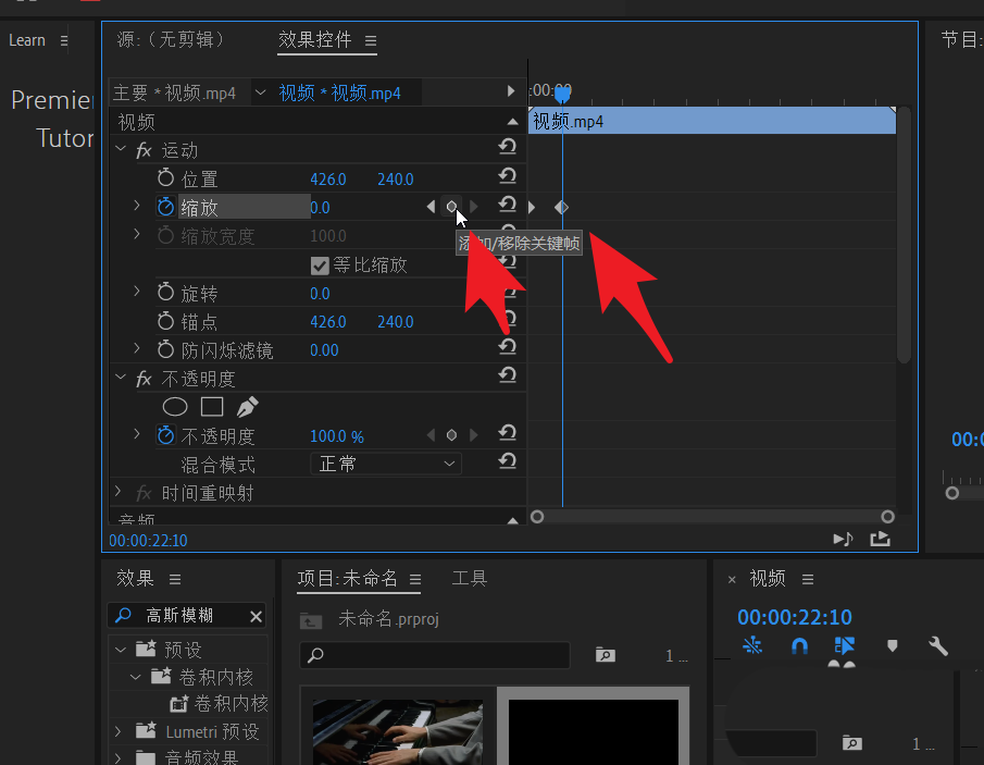 点击缩放前面的码表。这时就可以对视频添加关键帧处理了。