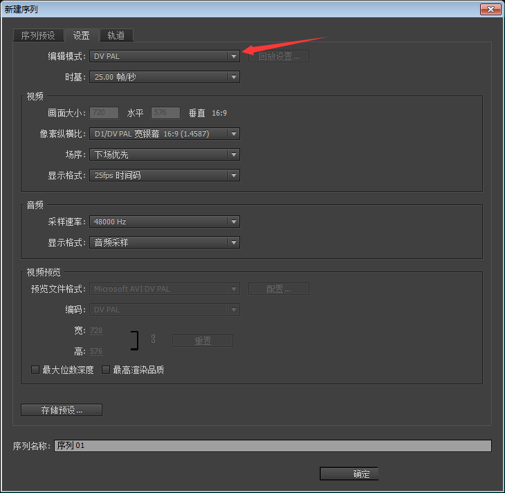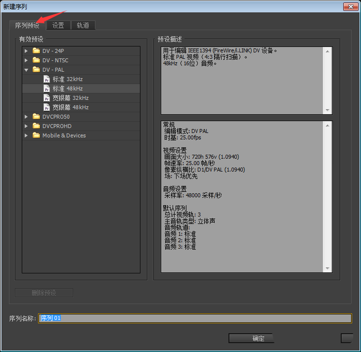 2、首先进入的是这样的界面。序列设置中有很多预设的序列,常用的序列设置是DV-PAL标准48KHz