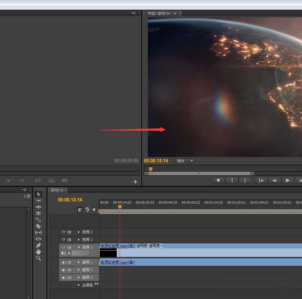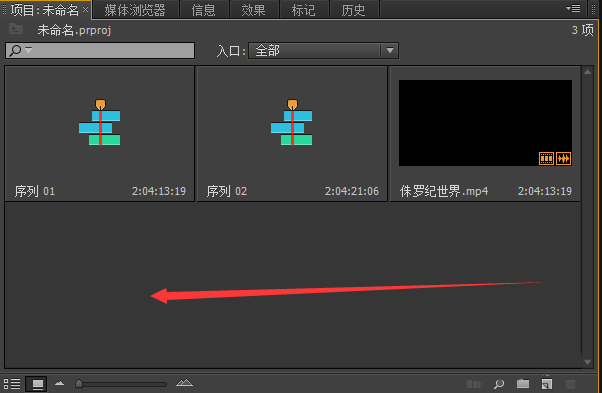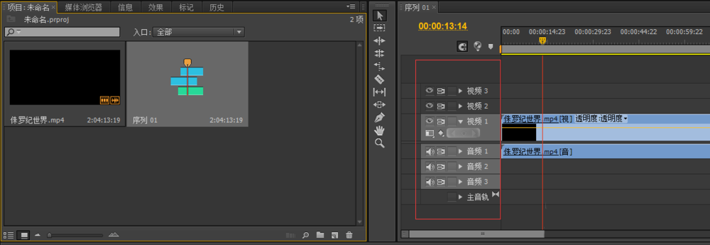 8、点击确认后就可以进入pr编辑画面了。单击刚才建立的序列,可以看到由视频层和音频层组合出来的序列文件。